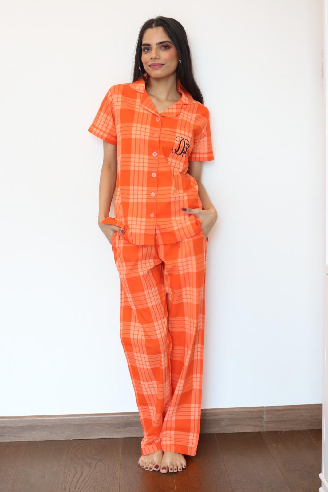 Our Orange Plaid Set is in Button up short sleeve with self piping. Drawstring pajamas with pockets. Chest pocket with an option to monogram the pocket with your choice of name or initials.100% Cotton. Ships in 7-10 days Wash care instructions: Machine wash, Tumble dry low, Do not bleach, Drycleanable, Iron if required